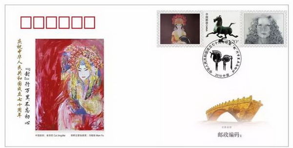 纪念封主图画作《京韵》是双方艺术家一见面,就迅速达成的共识。两人都擅长画女性肖像,又都有着东方血脉。所以两人一致决定共同描绘了一位头戴中国传统京剧头饰的当代少女,以红色为主体色调,以中国传统工笔画细腻写实的手法加入了西方唯美主义写实油画的透视关系,结合中西方传统绘画的优点,加入现代绘画中光影和写实的技巧手法,向大家展示了一幅充满了当代美,符合现代人审美气息的“新”工笔绘画作品。